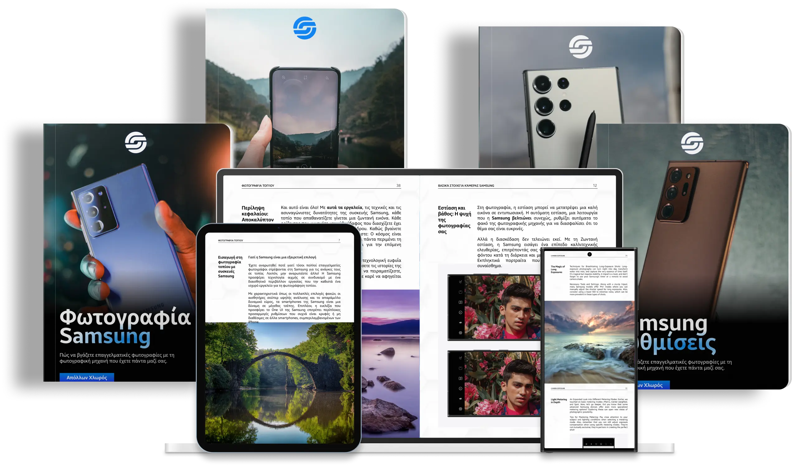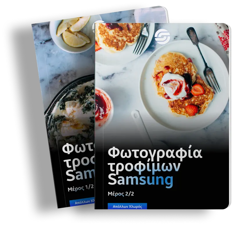 Αυτή τη στιγμή προσφέρουμε έξι βιβλία: Φωτογραφία Samsung, Φωτογραφία τοπίου Samsung, Samsung Ρυθμίσεις, Μετεπεξεργασία Samsung, Φωτογραφία για κινητά με τεχνητή νοημοσύνη και Φωτογραφία τροφίμων Samsung. Κάθε βιβλίο επικεντρώνεται σε ένα συγκεκριμένο θέμα και καλύπτει τα πάντα, από τη σύνθεση και το φωτισμό, μέχρι την μετεπεξεργασία και τις τεχνικές επεξεργασίας.